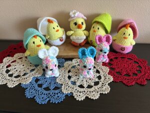 Kim is making special mini fabric Easter baskets with bunny stuffed animals.